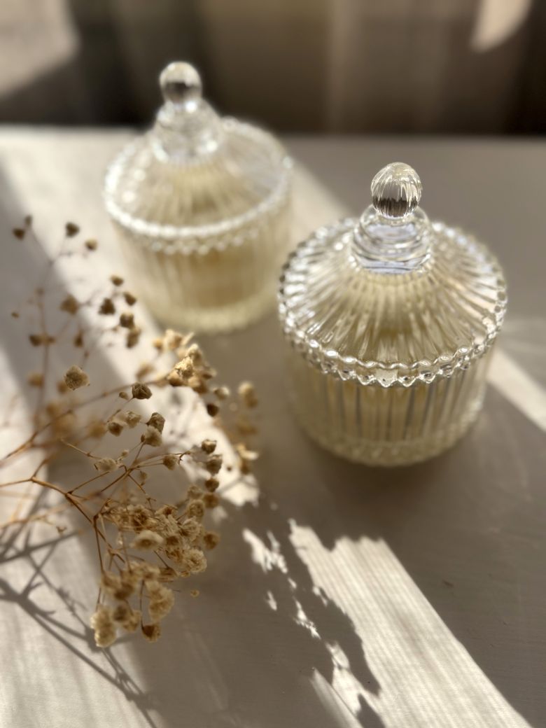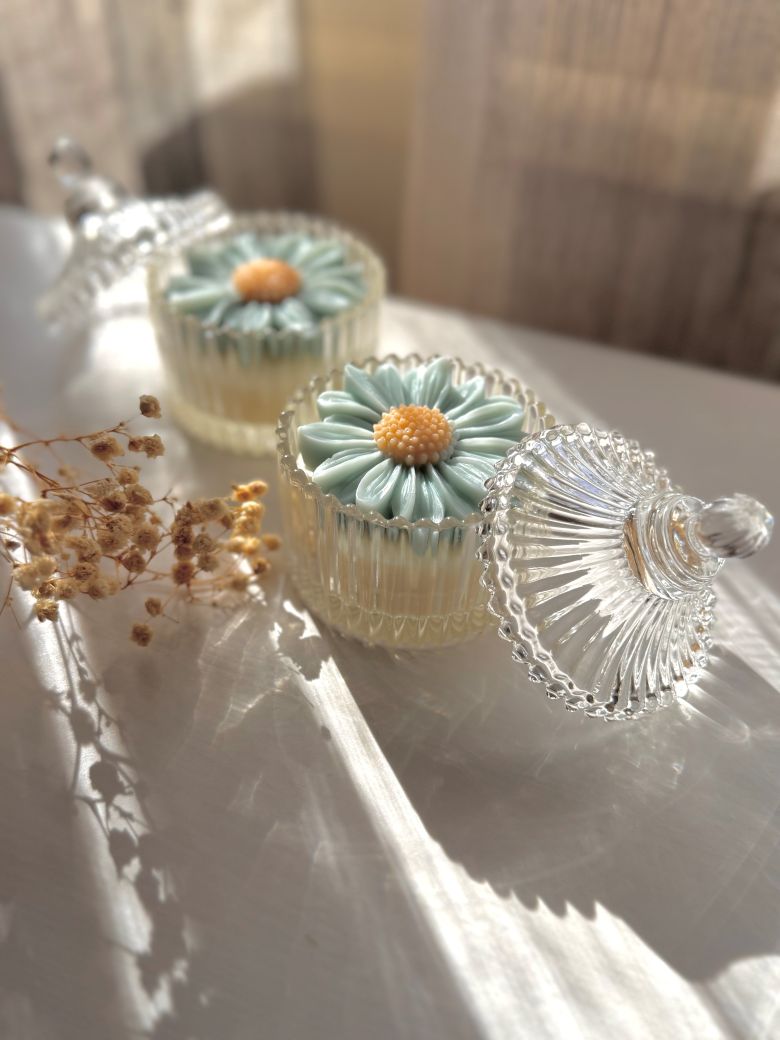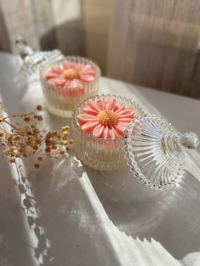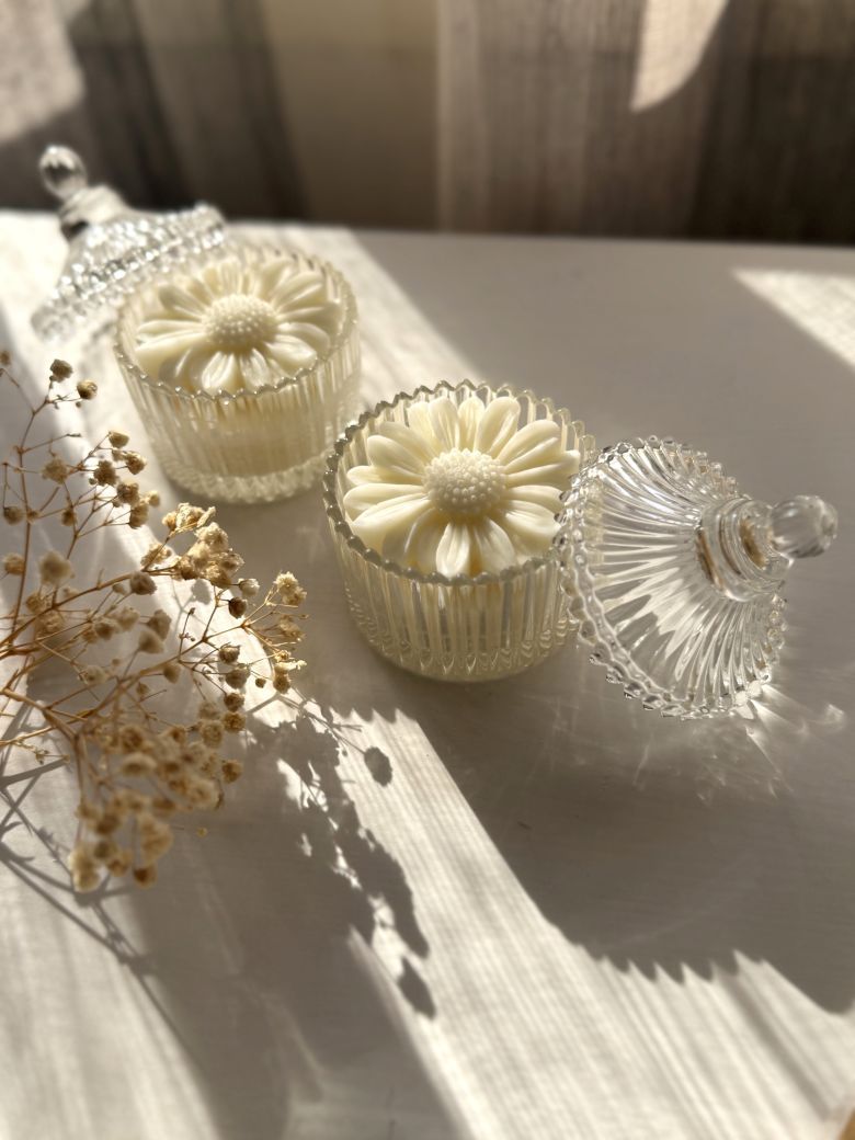 An elegant glass candle favor adorned with a delicate daisy flower decoration. A romantic and graceful choice for weddings and christenings, ideal for soft and natural themes.